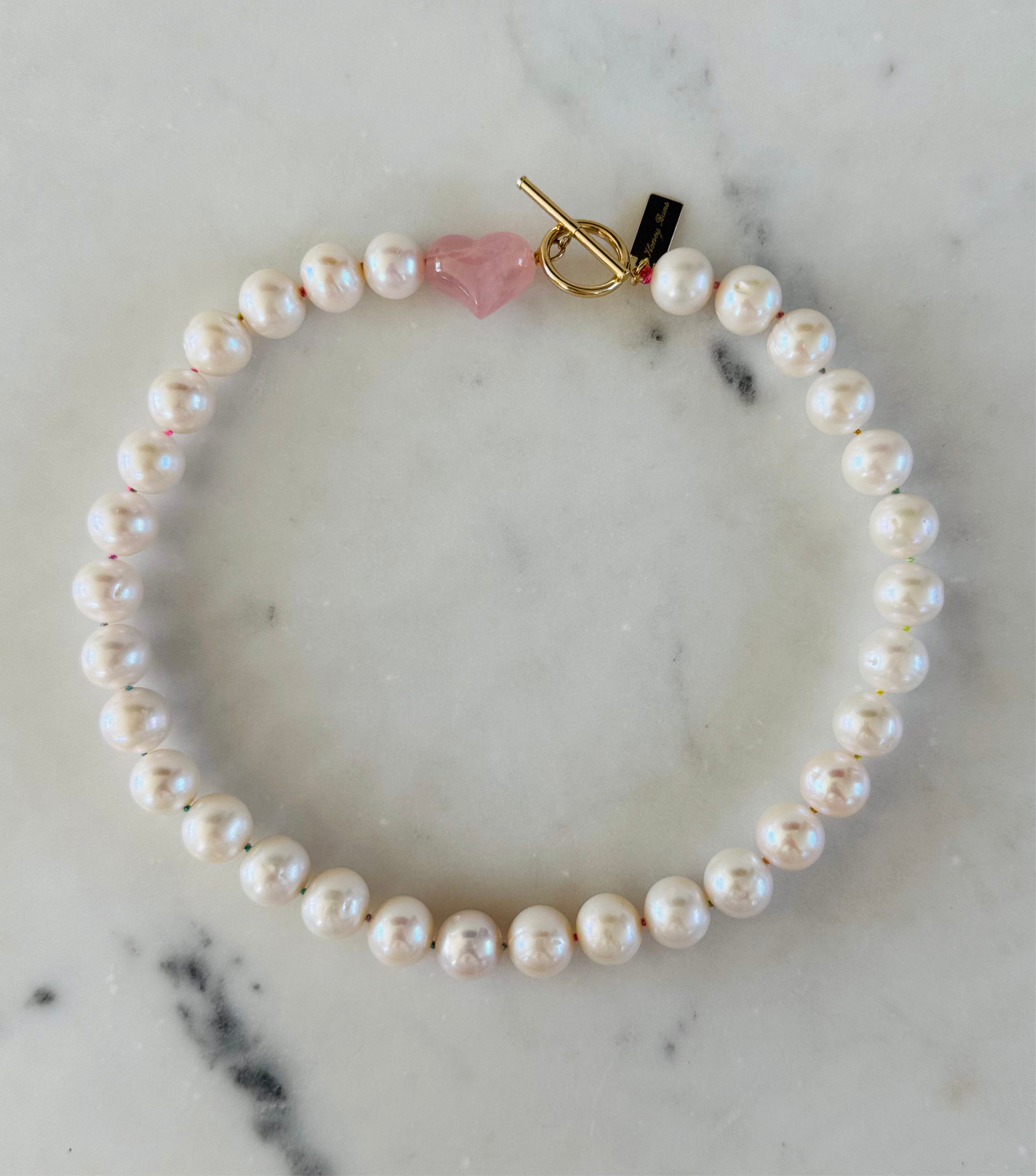 The power of love! Luscious, creamy white 11-12mm freshwater pearls are lovingly hand knotted on custom dyed pastel rainbow silk. A puffy pink rose quartz heart finishes the look. Hardware 14k gold. 15.5” long.
