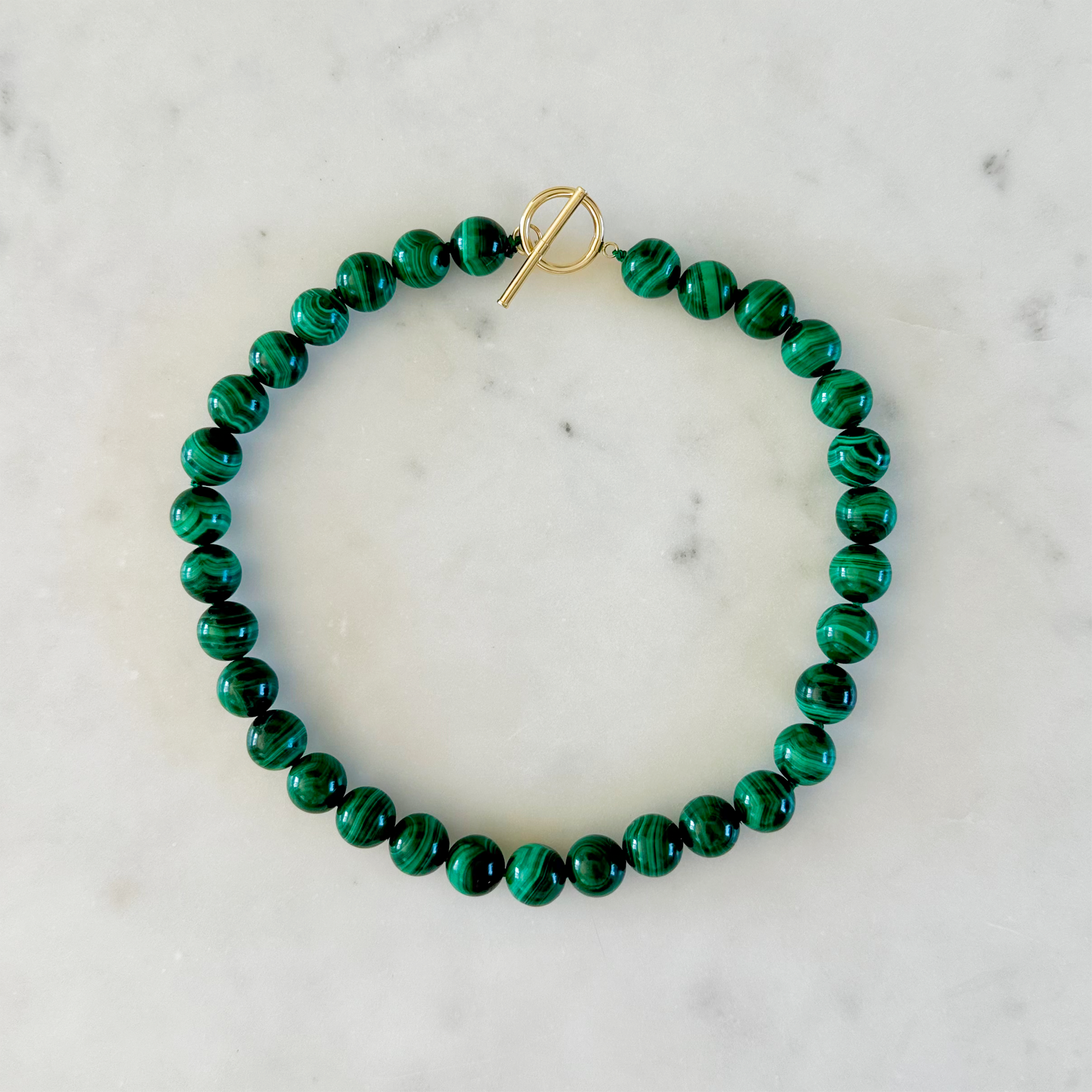 Substantial, swirly malachite individually hand knotted on emerald green silk in a petite necklace length. 14.25” long. 14k gold hardware.